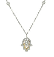 18kt white and yellow gold micro prong set round brilliant diamond hamsa pendant.