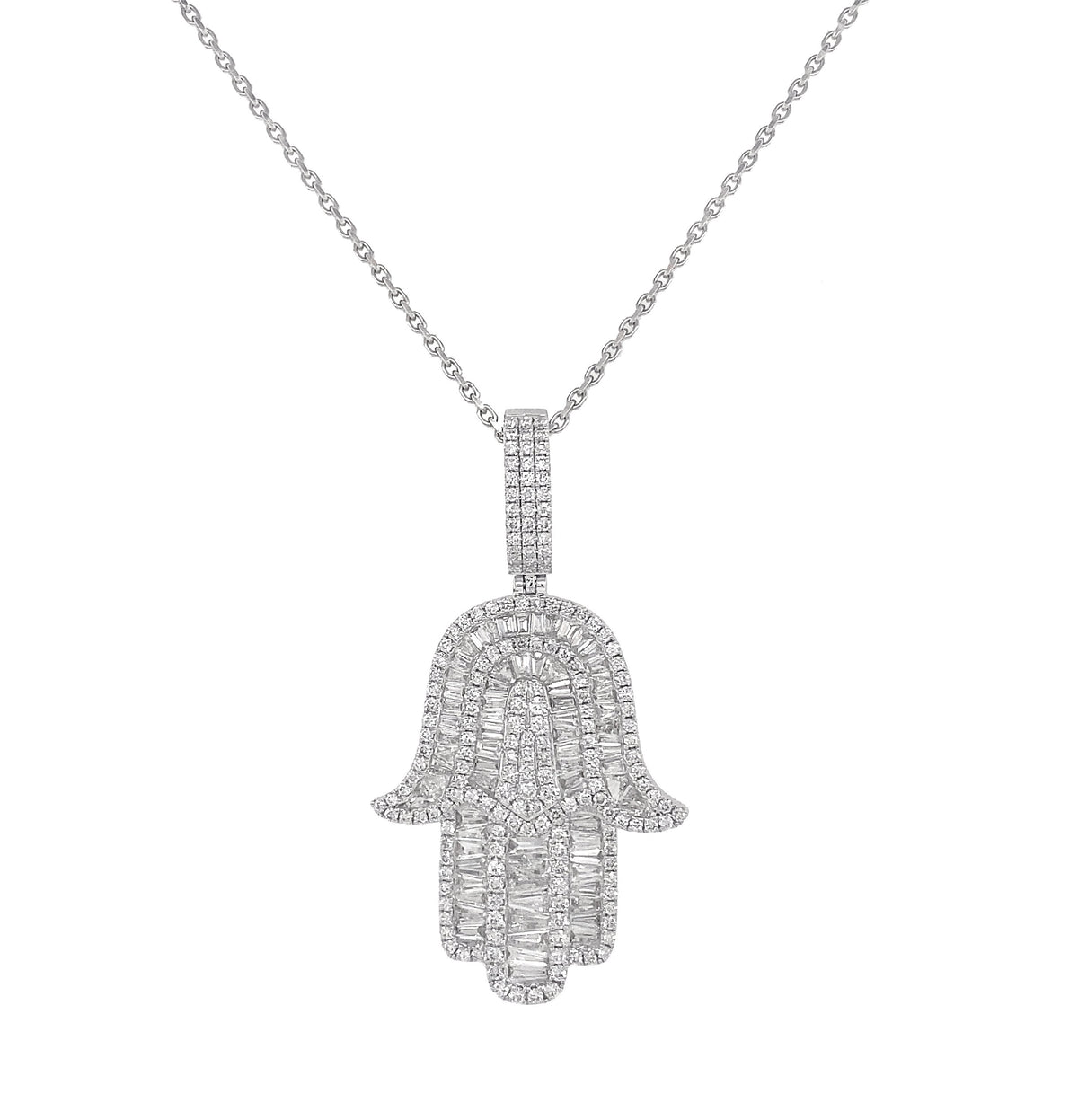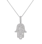 18kt white gold micro prong set round brilliant diamond and channel set baguette diamond hamsa pendant.