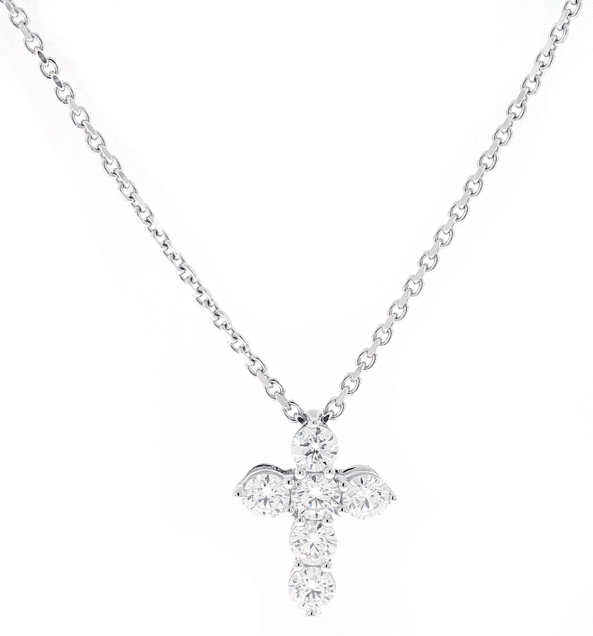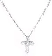 18kt white gold micro prong set round brilliant diamond mini cross pendant.