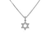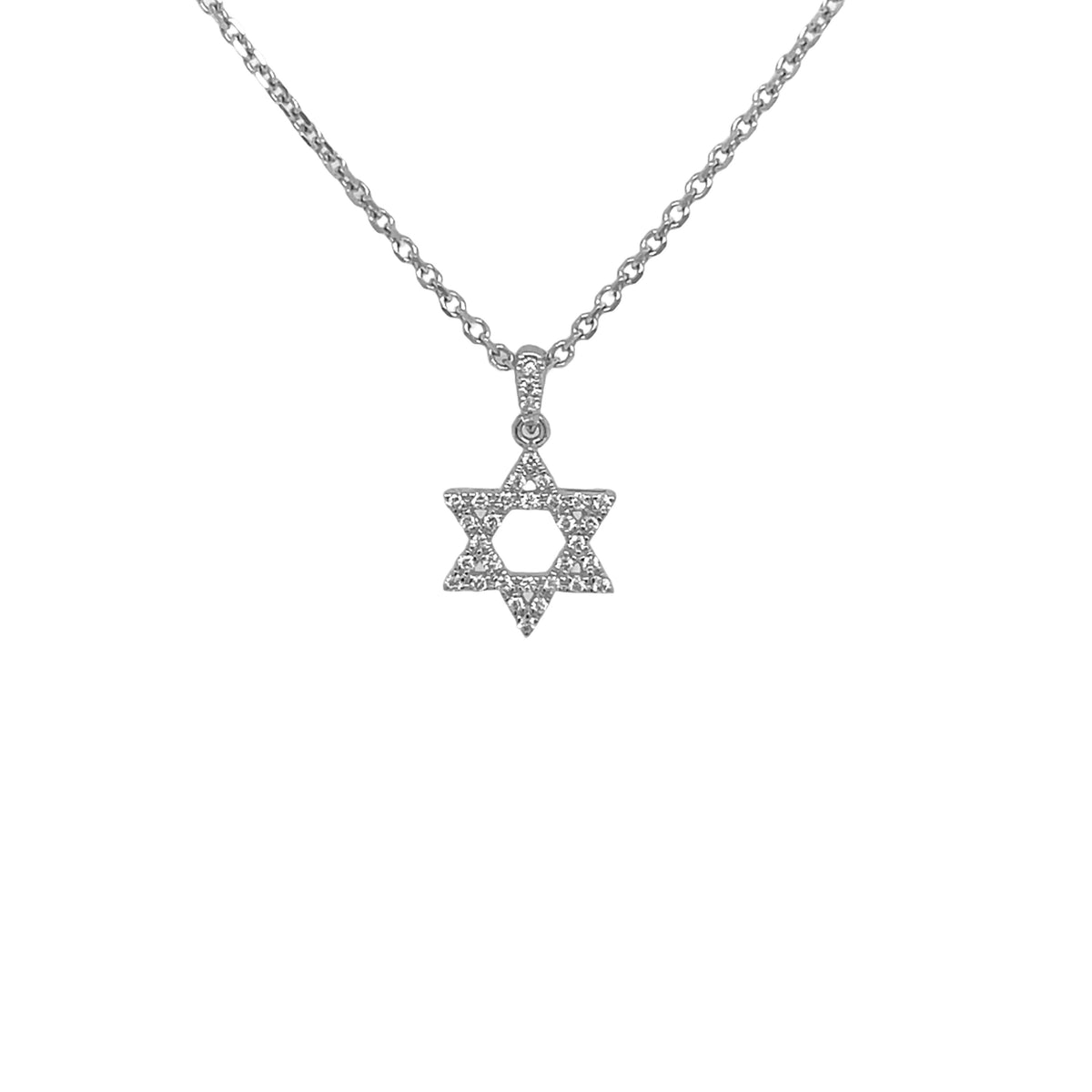 18kt white gold micro prong set round brilliant diamond star of diamond pendant with 14kt white gold cable link chain.