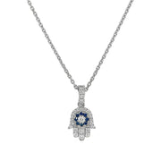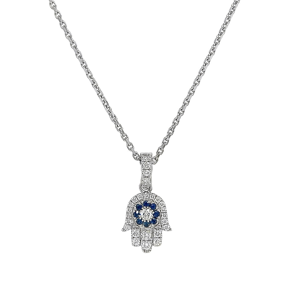 18kt white gold micro prong set sapphire and round brilliant diamond hamsa pendant.