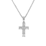 18kt white gold V-prong set emerald cut diamond cross pendant with 14kt white gold cable link chain.