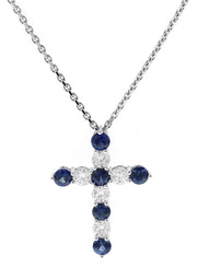 18kt white gold mutual prong set round brilliant diamond and blue sapphire cross pendant with 14kt white gold cable link chain