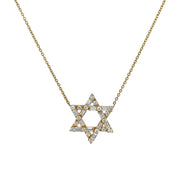 18kt yellow gold prong set baguette and round brilliant diamond star of david pendant.