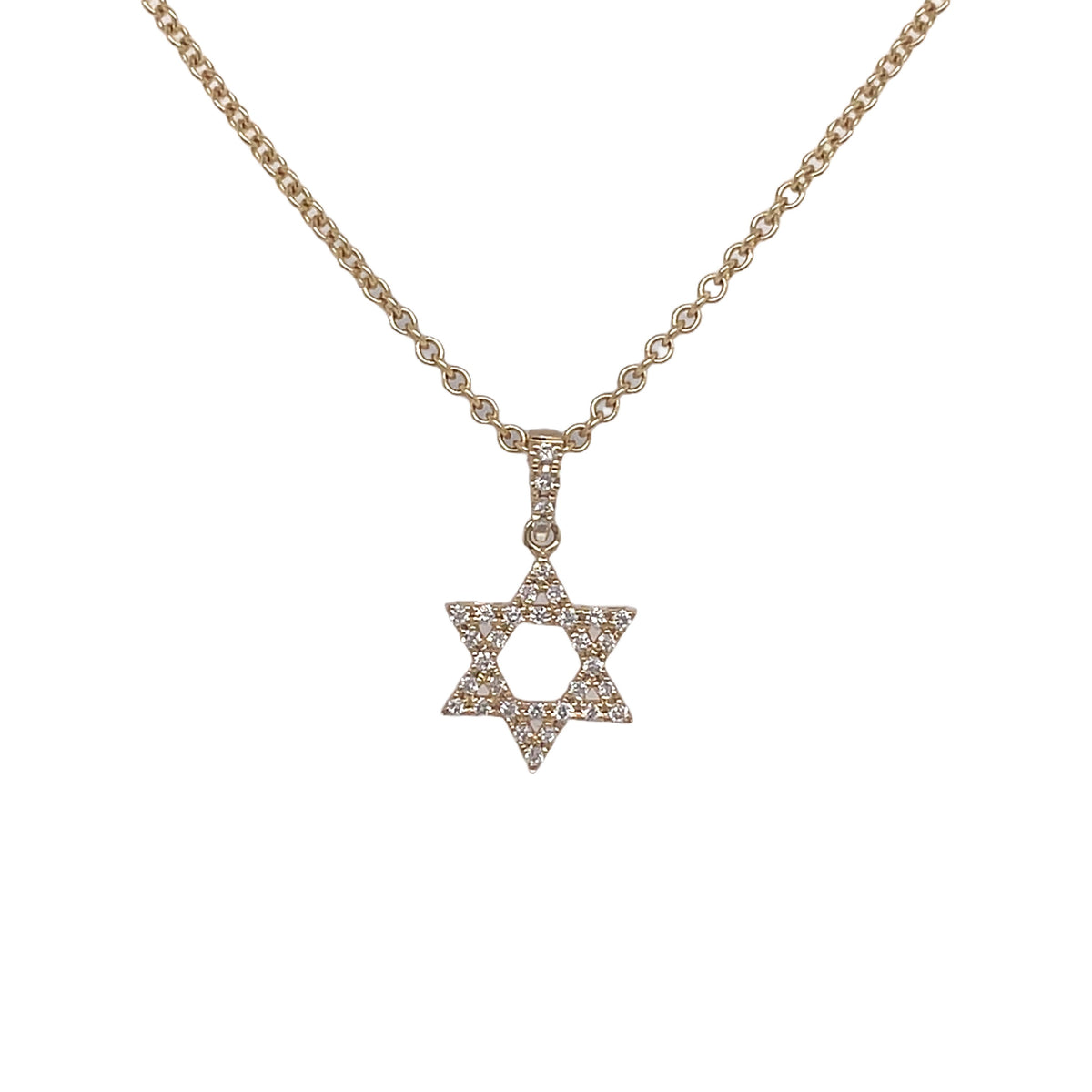 18kt yellow gold micro prong set round brilliant diamond star of david pendant with 14kt yellow gold cable link chain.