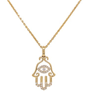 18kt yellow gold micro prong set round brilliant diamond hamsa pendant.