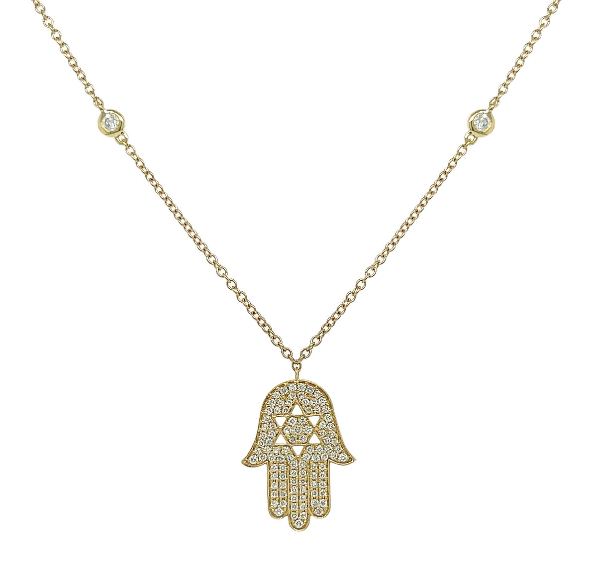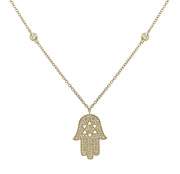 18kt yellow gold micro pave set round brilliant diamond hamsa pendant.
