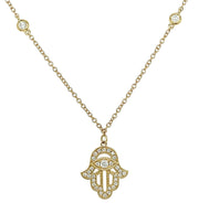18kt yellow gold micro pave set round brilliant diamond hamsa pendant.