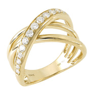 18kt yellow gold micro prong set round brilliant diamond criss-cross ring.