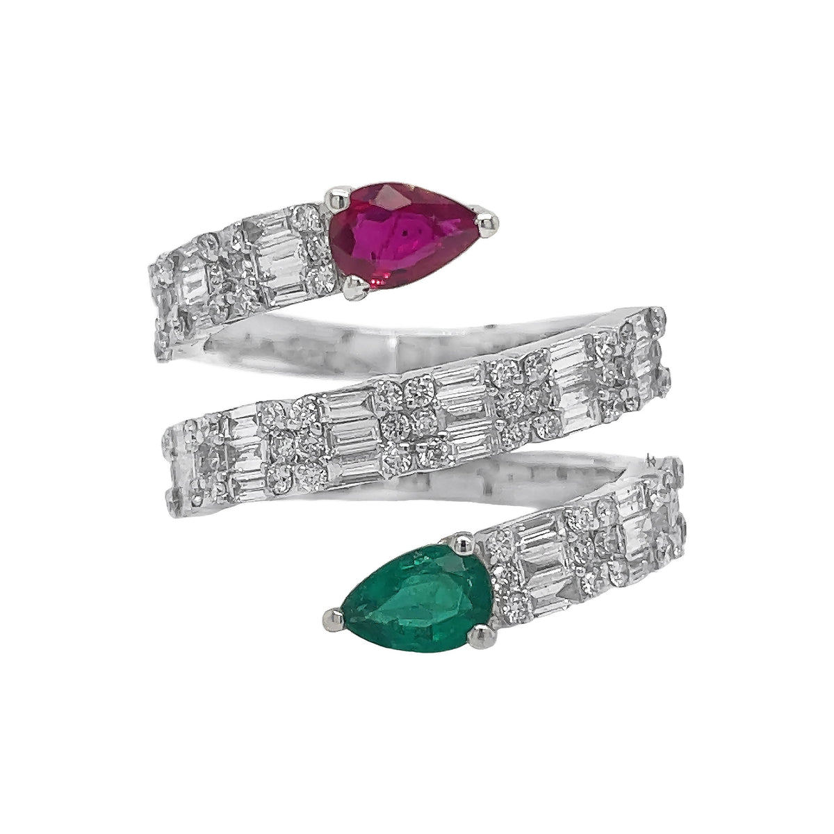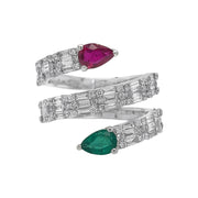 18kt white gold micro prong set baguette and round brilliant diamond multi-row ring with pear shaped ruby and green emerald at the end.