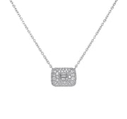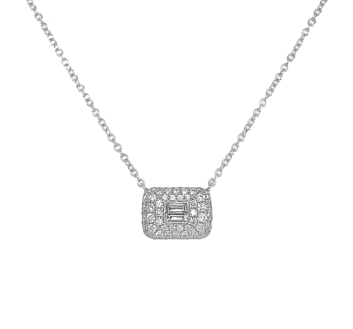 18kt white gold channel set baguette and micro prong set round brilliant diamond cluster pendant.