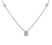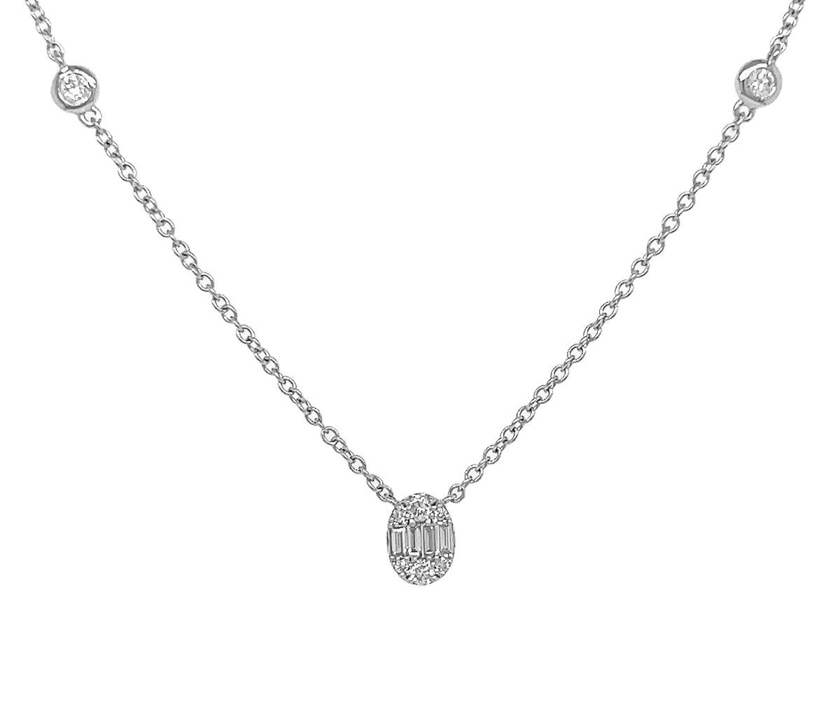 18kt white gold micro prong set baguette and round brilliant diamond cluster pendant.