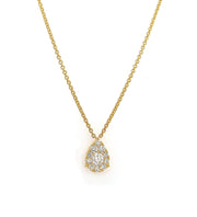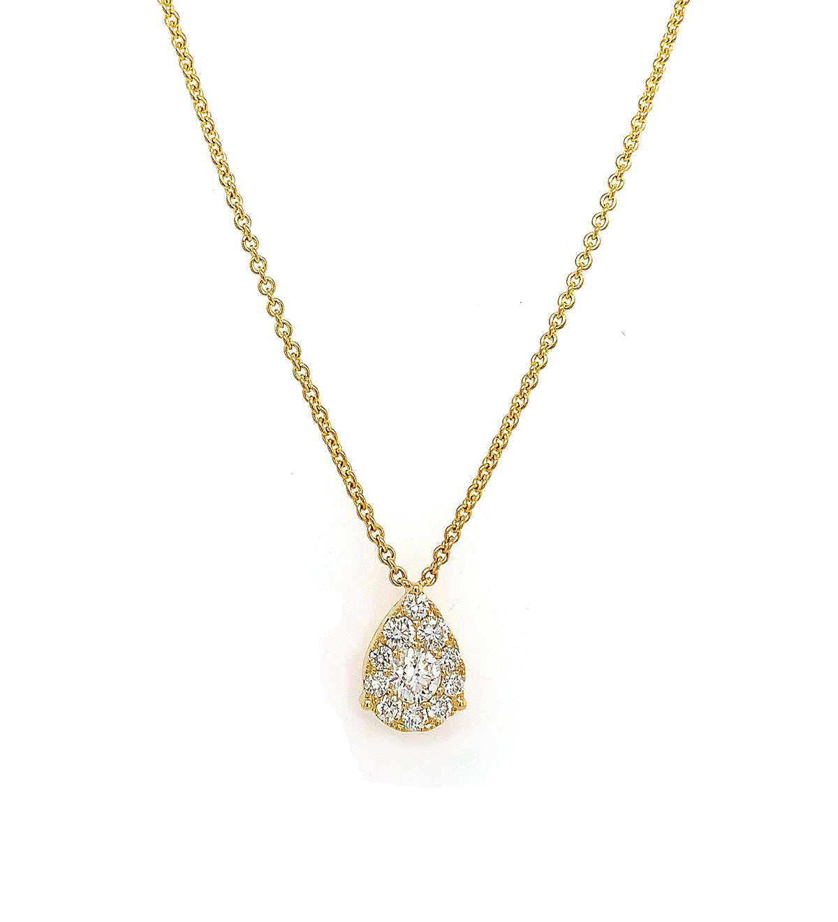 18kt yellow gold micro prong set round brilliant diamond pear shape cluster necklace.