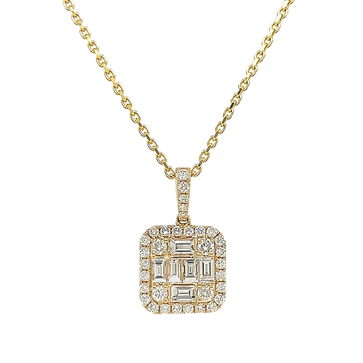 18kt yellow gold channel set baguette and micro prong set round brilliant diamond cluster pendant with 14kt yellow gold cable link chain.