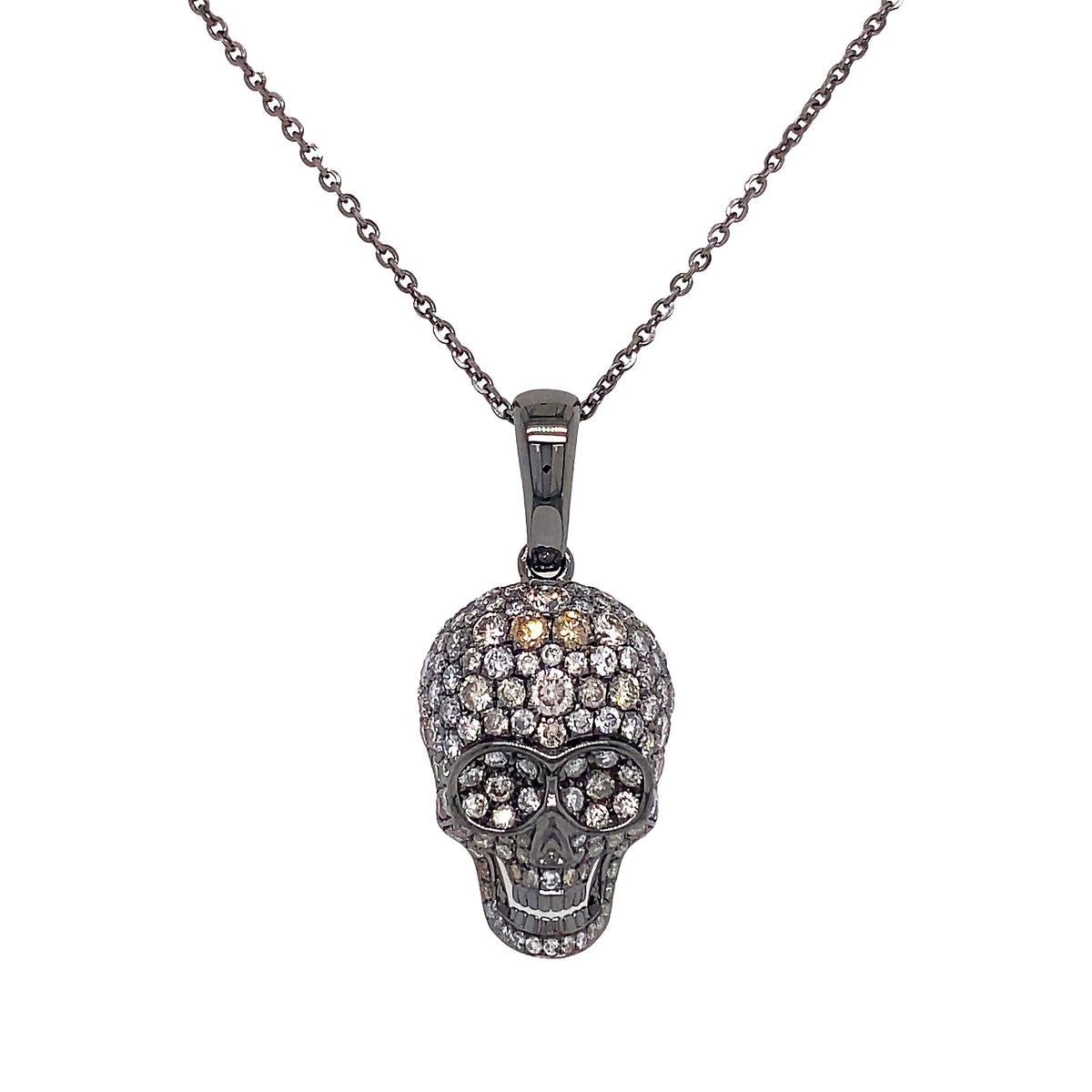 18kt black gold micro pave set multi-color round diamond skull pendant with 18kt black gold cable link chain.