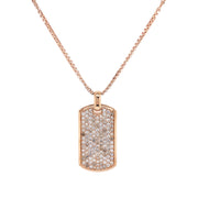18kt rose gold micro pave set multi-color round diamond name plate pendant.