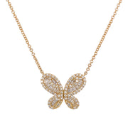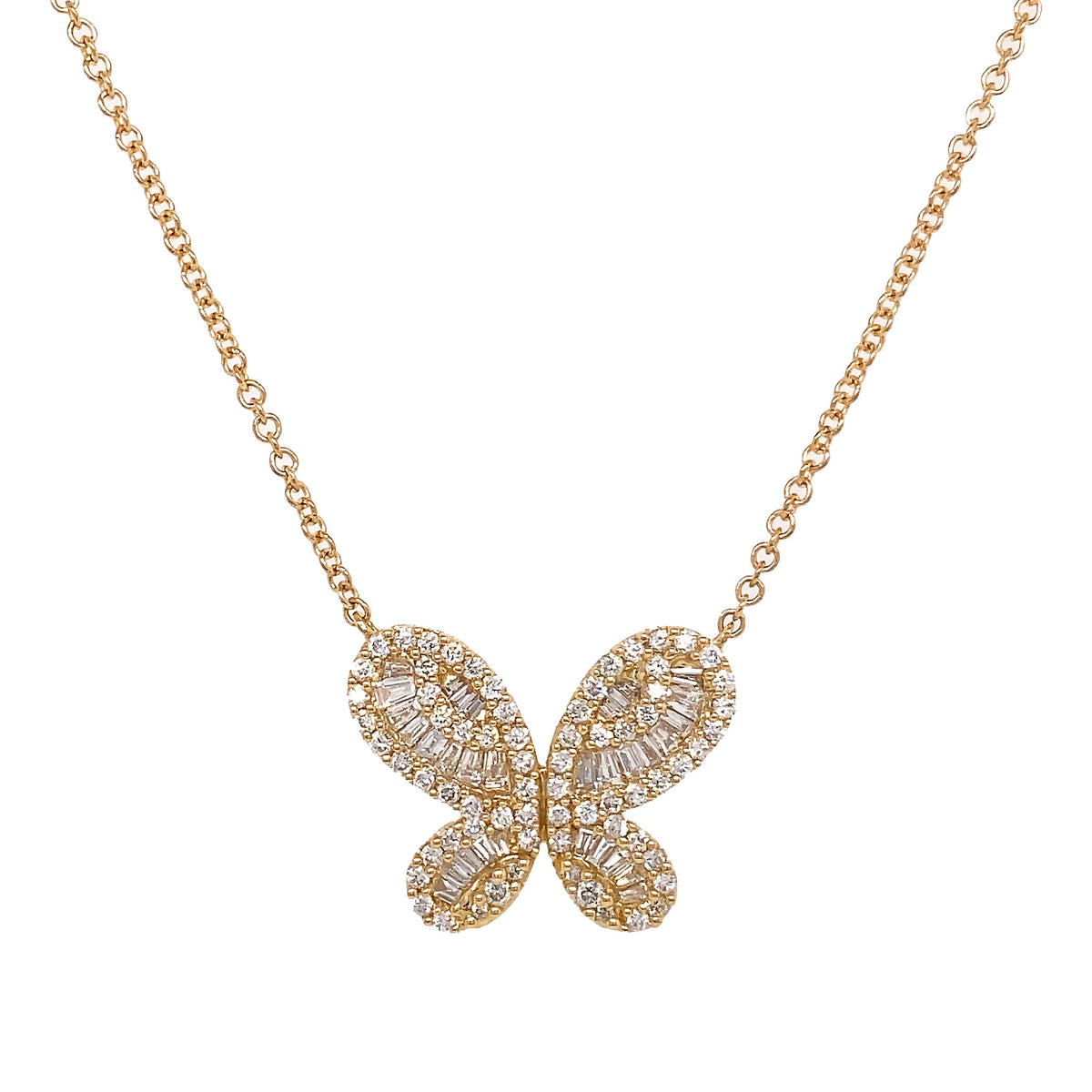 18kt yellow gold channel set baguette and micro pave set round brilliant diamond butterfly pendant.