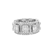 18kt white gold invisble and prong set baguette, princess cut and round brilliant diamond multi-cluster eternity band.