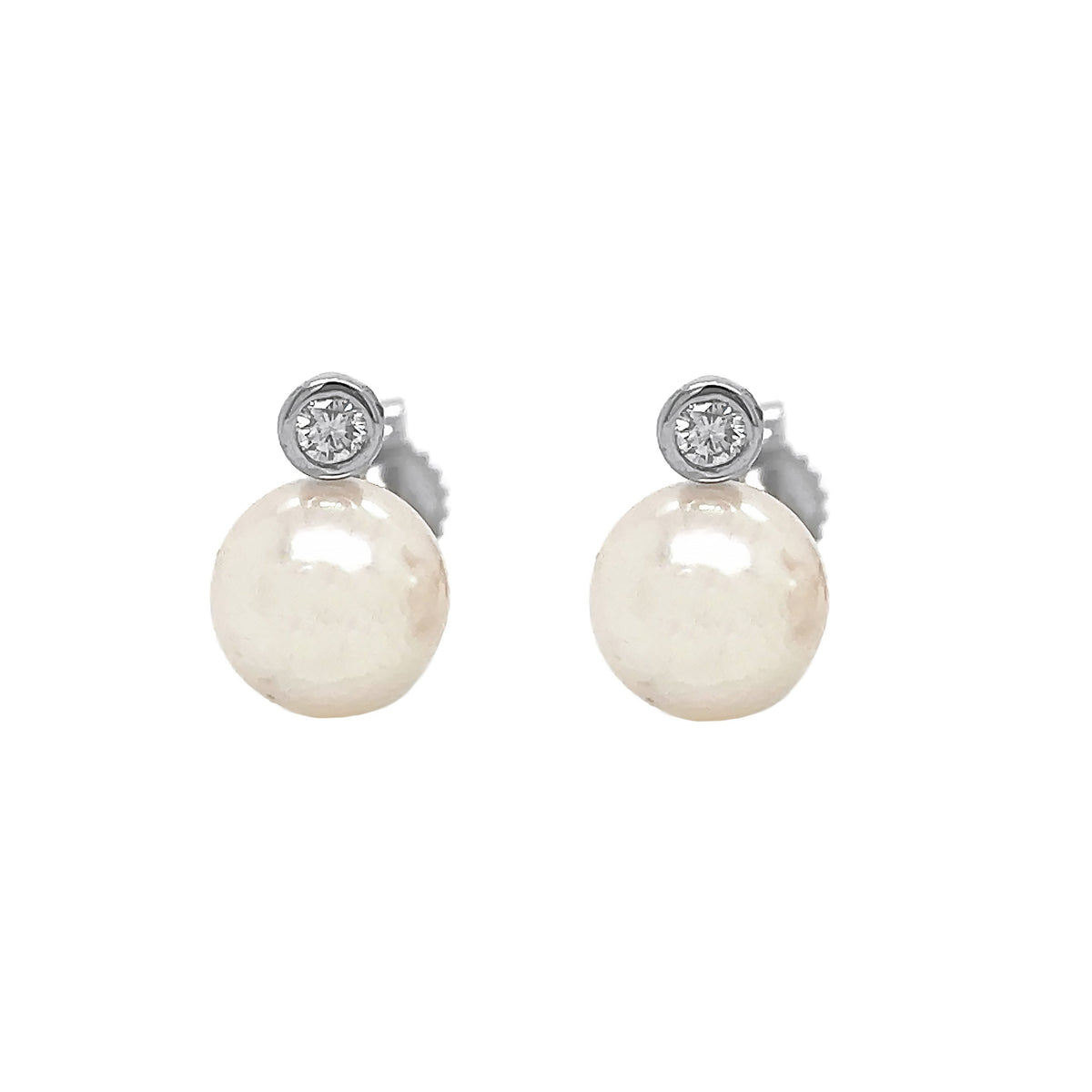 18kt white gold bezel prong set round brilliant diamond and pearl pendant.