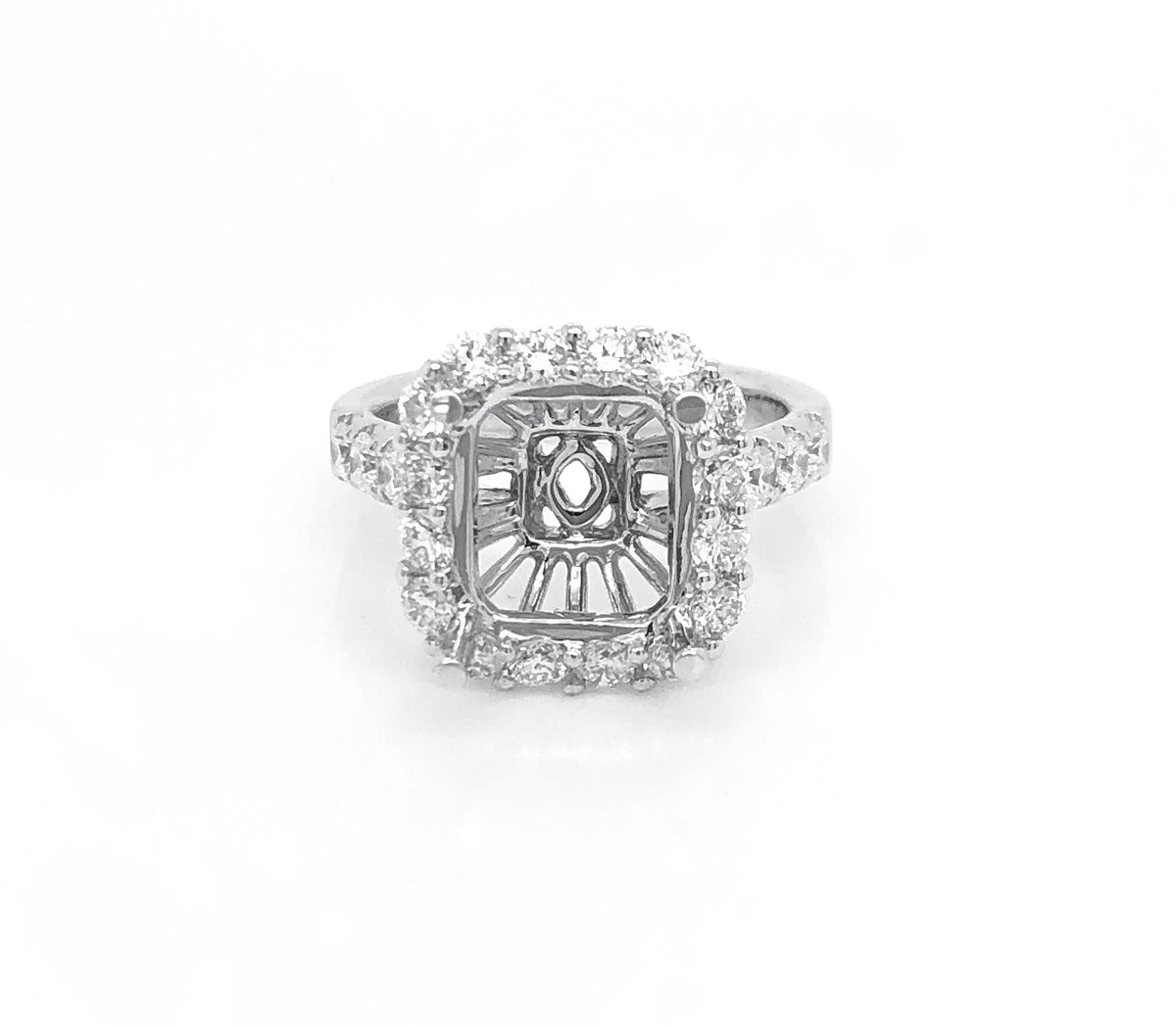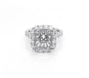 18kt white gold micro prong and mutual prong set round brilliant diamond halo semi-mount for emerald cut diamond.