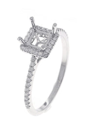 18kt white gold micro prong set round brilliant diamond princess cut halo semi-mount.