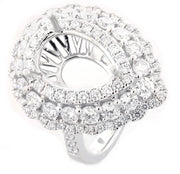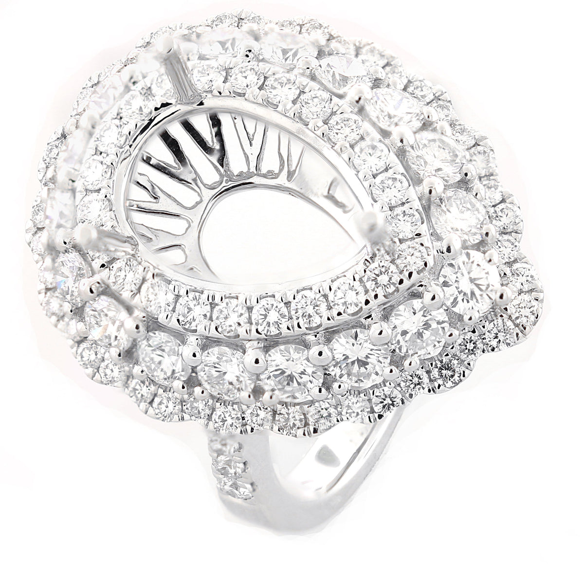 18kt white gold micro pave set and mutual prong set round brilliant three row pear shape halo semi mount (third row has a scalloped edge)