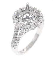 18kt white gold micro prong and mutual prong set round brilliant diamond round shape halo semi mount with split shank.