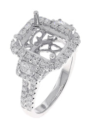 18kt white gold micro prong set round brilliant diamond emerald shape halo semi mount with trillion on sides and split shank.