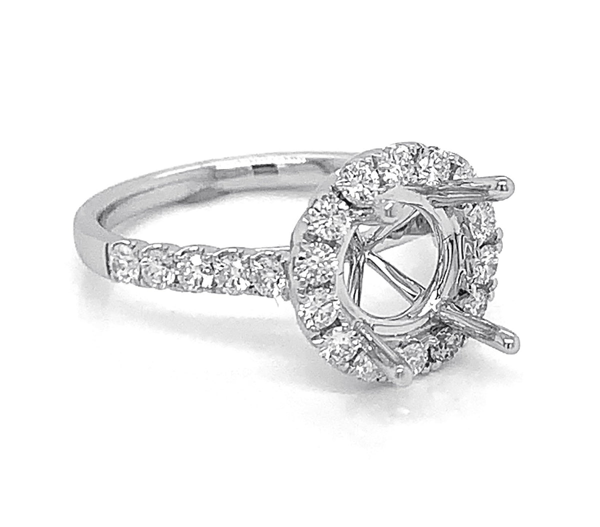 18kt white gold micro prong set round brilliant diamond semi mount with halo and diamonds on shank.