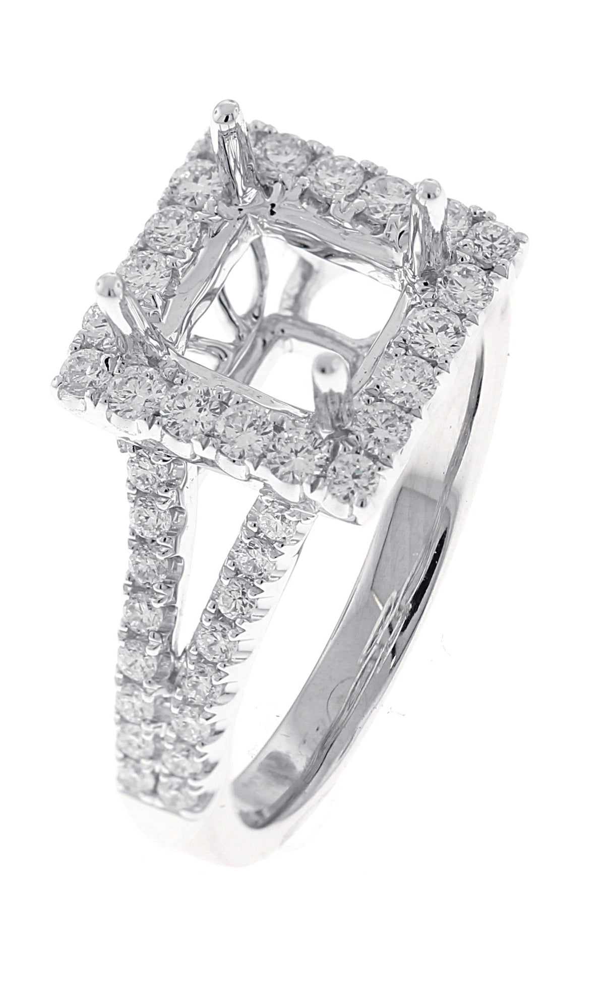 18kt white gold micro prong set round brilliant diamond princess cut halo semi mount with split shank.