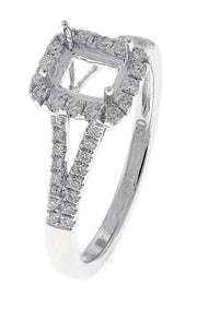 18kt white gold micro prong set round brilliant diamond cushion halo semi mount with split shank.