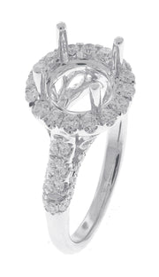 18kt white gold micro prong set round brilliant diamond semi-mount with halo and diamonds on gallery.
