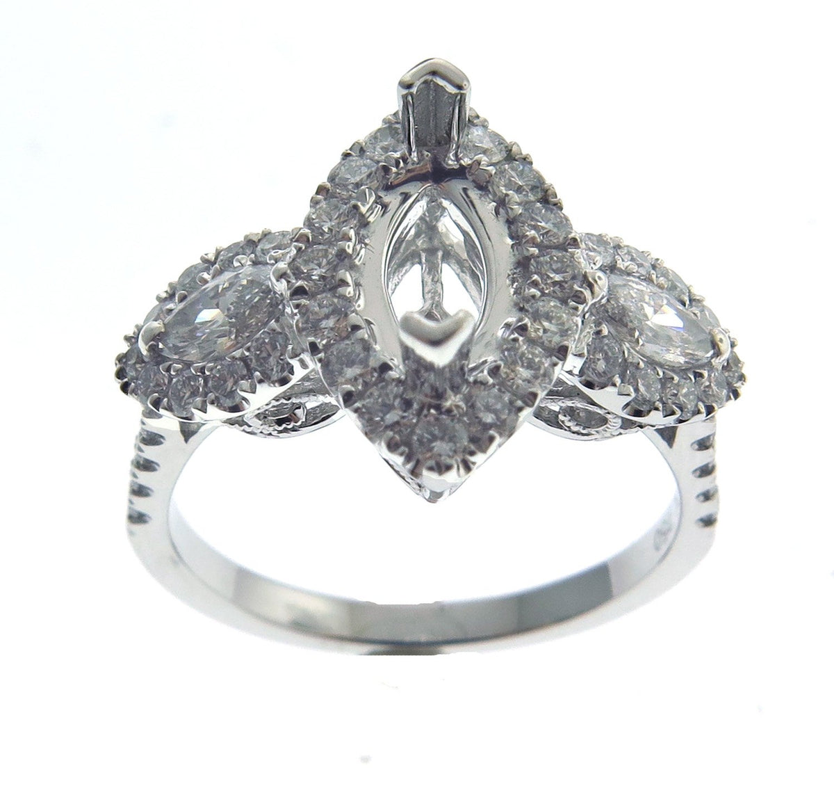 18kt white gold micro pave set round brilliant diamond setting with halo and two marquise cut side stones