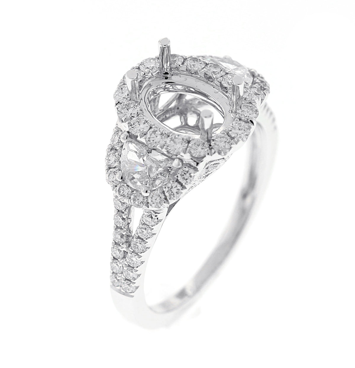 18kt white gold micro prong and prong set half moon and round brilliant diamond oval shape halo semi mount with diamond gallery, split shank, and half moon diamonds on the side
