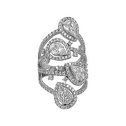 18kt white gold invisible set marquise, pear, princess, and round brilliant diamond multi-cluster multi-row ring.