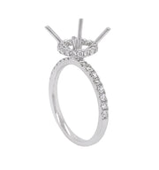 18kt white gold 4 prong under-halo semi-mount with micro prong set round brilliant diamond on gallery and shank.