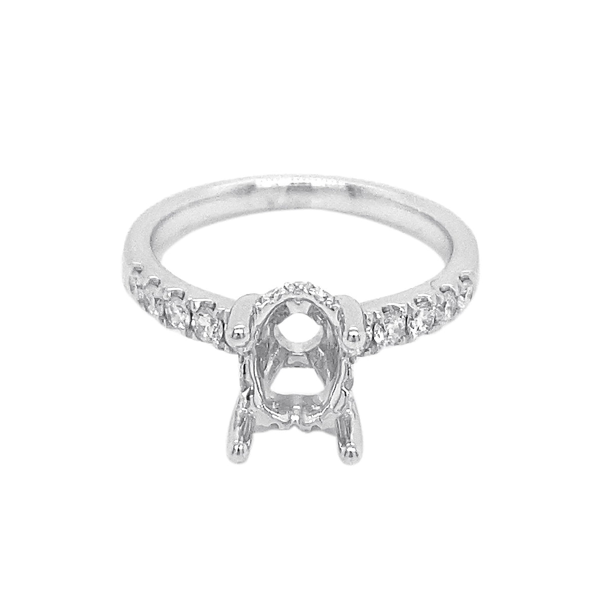 18kt white gold 4 prong oval semi-mount with micro prong set round brilliant diamond shank and gallery.