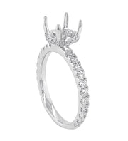 18kt white gold micro prong set round brilliant diamond semi-mount with diamonds on 3/4 shank.