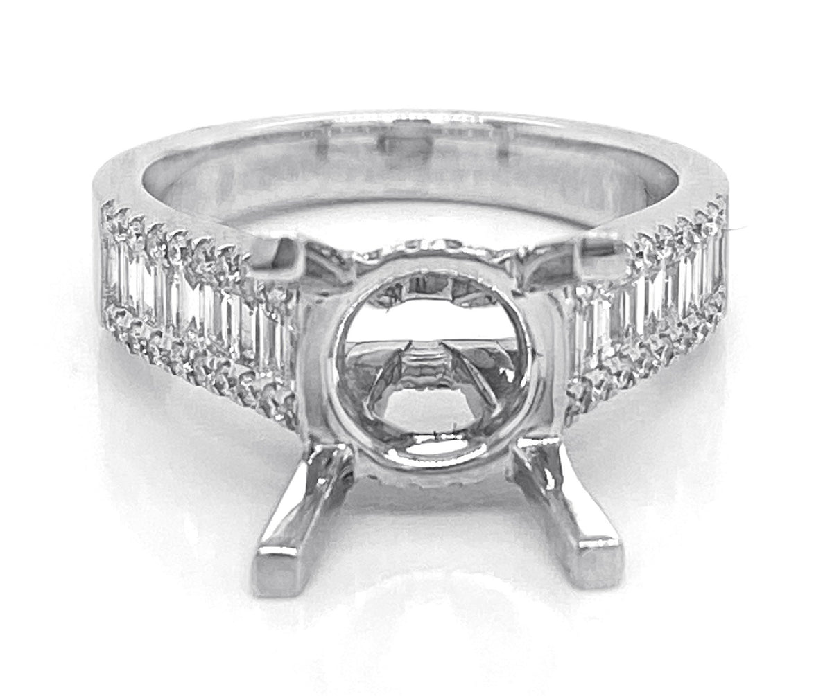 18kt white gold semi-mount with micro prong and channel set baguette and round brilliant diamond shank (for round stone).