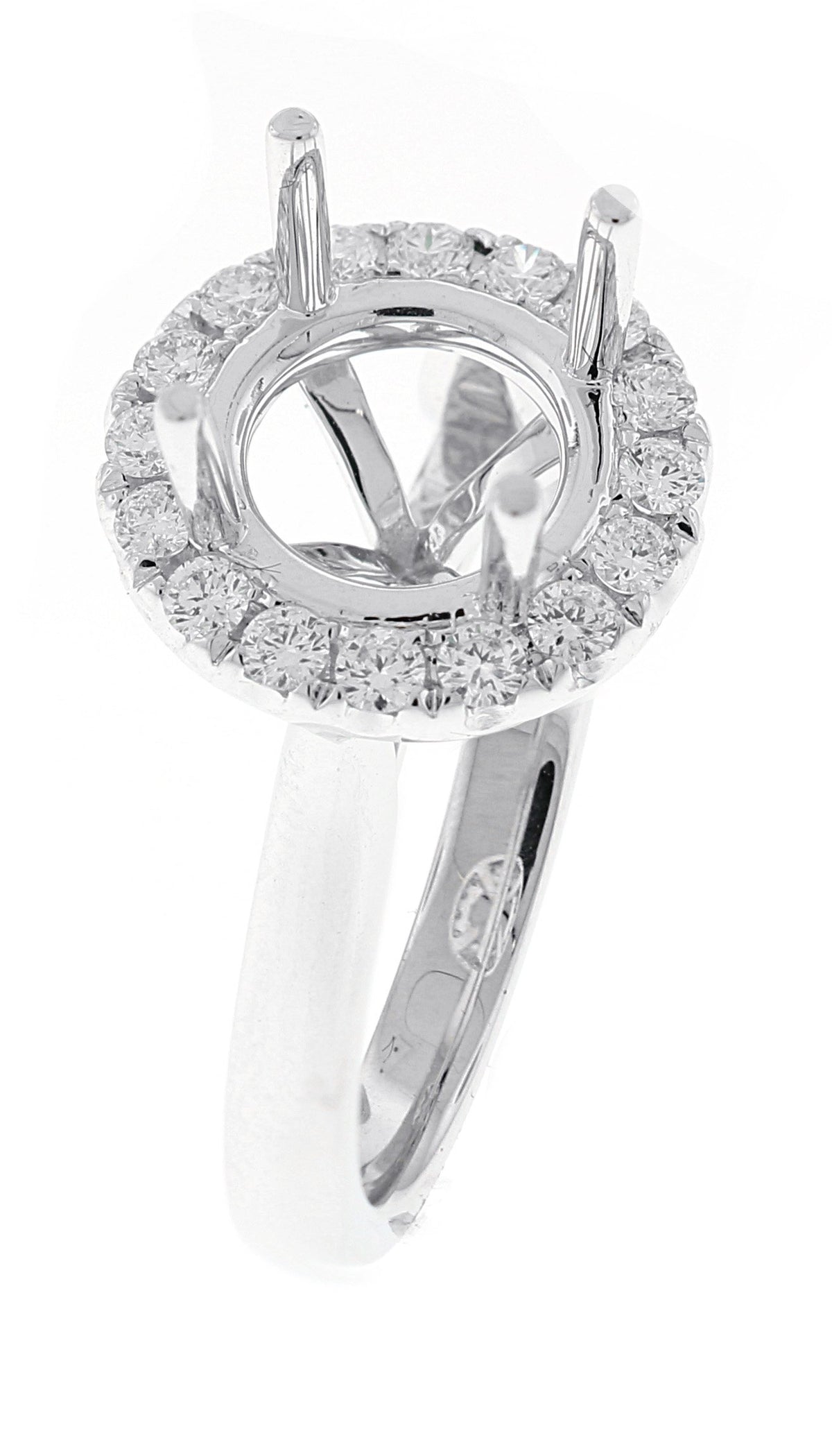 18kt white gold micro prong set round brilliant diamond oval semi-mount.