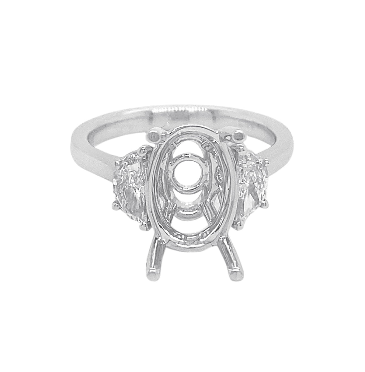 18kt white gold 4 prong oval semi-mount with 4 prong set half-moon diamonds on each side.