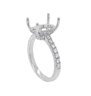 18kt white gold 4 prong oval shaped semi-mount with micro prong set round brilliant diamond on gallery and shank.