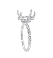 18kt white gold 4 prong oval under-halo semi-mount with micro prong set round brilliant diamond on the gallery and shank.