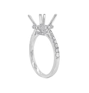 18kt white gold 4 prong under-halo semi-mount with micro prong set round brilliant diamond on gallery and shank.