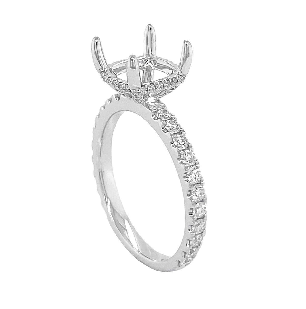 18kt white gold micro prong set round brilliant diamond cushion semi-mount with diamond on 3/4 shank.