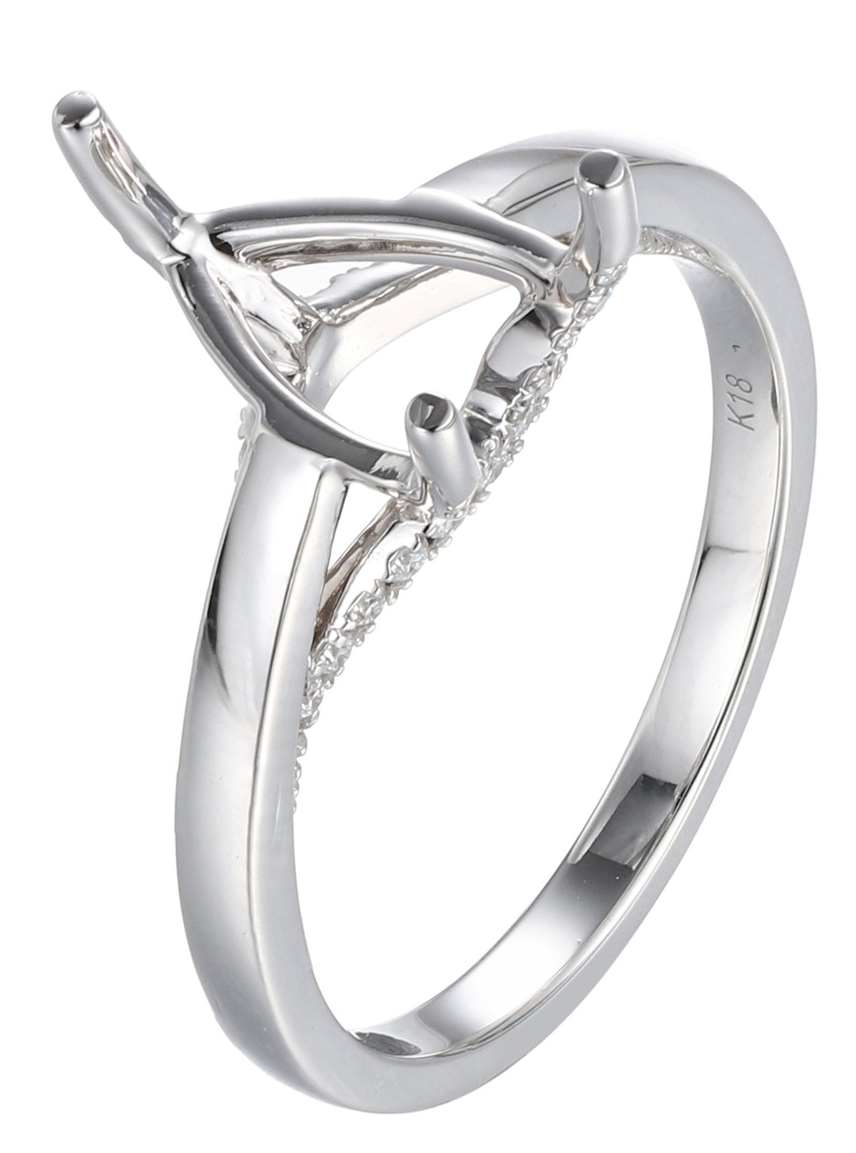18kt white gold 3 prong pear shaped semi-mount with micro prong set round brilliant diamond on the gallery.