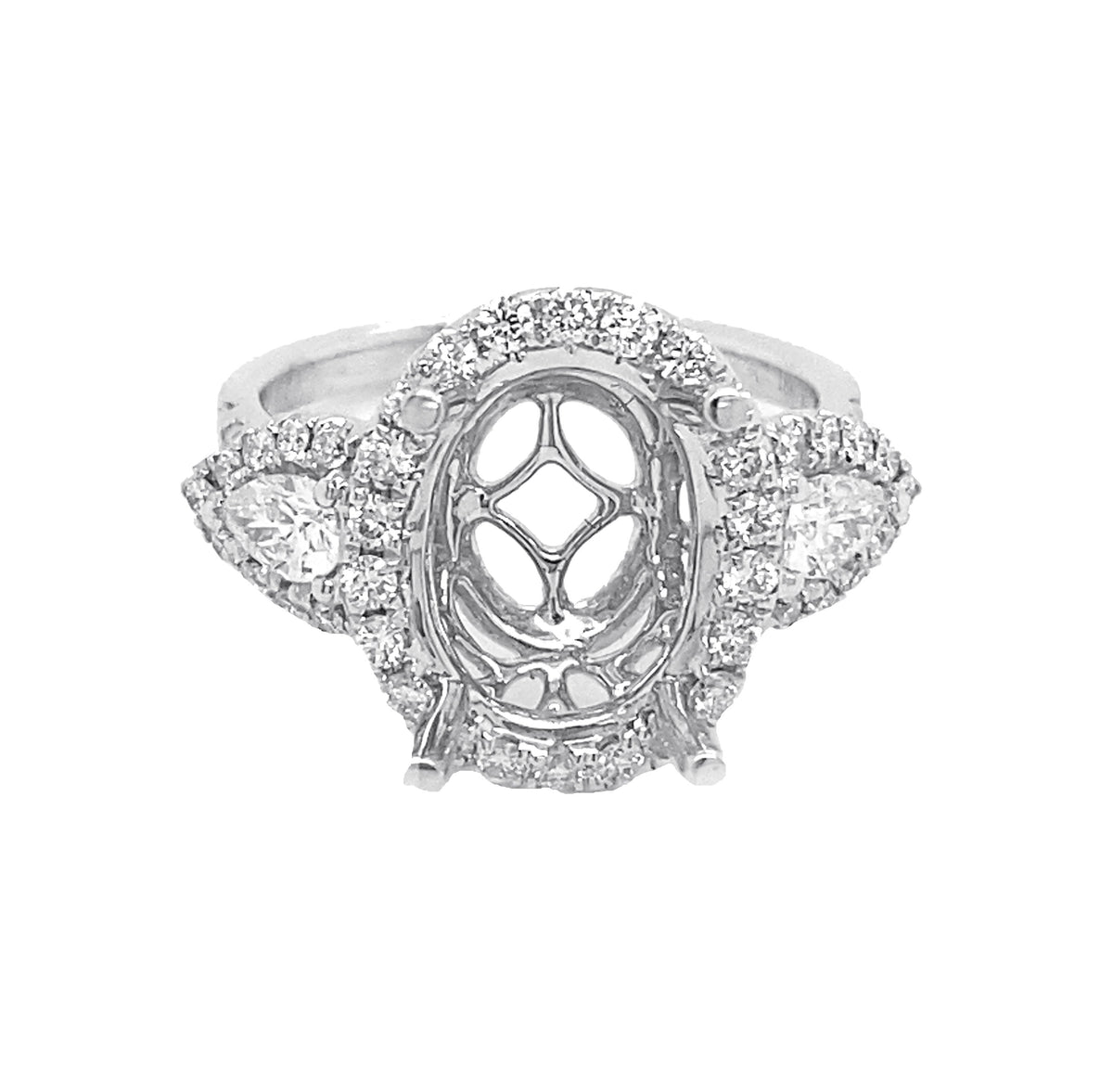 18kt white gold 4 prong set pear shaped diamond 3 stone semi-mount with micro prong set round brilliant diamonds on halo and shank.