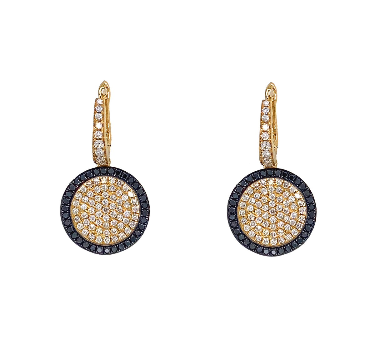 18kt yellow gold micro pave set white and black round diamond dangling circle earrings.