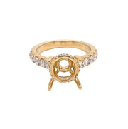 18kt yellow gold 4 prong semi-mount with micro prong set round brilliant diamond on gallery and shank.