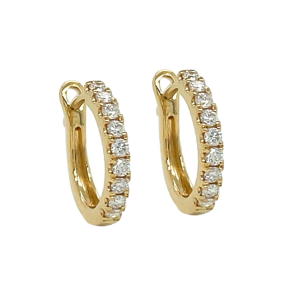 18kt yellow gold micro prong set round brilliant diamond huggie earrings.